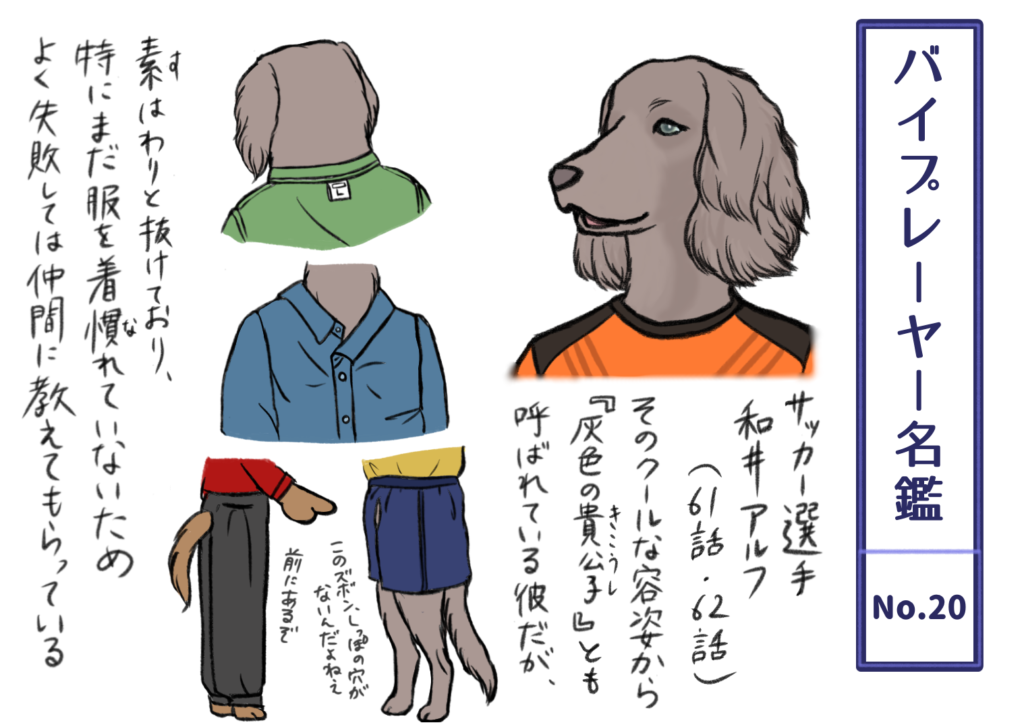バイプレーヤー名鑑20 バイプレーヤー名鑑 2026.04.10 62話の2コマめにも登場しています。 ナナイロ市に来る前は一度も服を着たことがなかったので、 着るのは新鮮で結構気に入っているのですが、 いかんせん着方がまだ覚え切れません。 そのギャップがまたいい とは思うのですが、 チームの意向でファンには秘密です。
