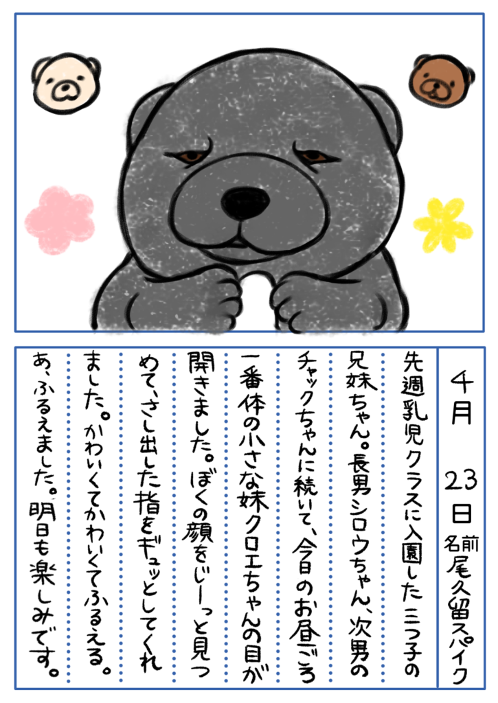 市民絵日記15 市民絵日記 2026.04.23 今日の絵日記を描いたのは、 第16話に登場した、保育士のスパイクさんです。 →第16話はこちら 保育士さんのお仕事は本当に大変ですが、 こうしてチビちゃんたちの成長を見られるのが 何よりのやりがいですね。