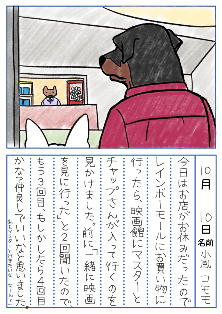 市民絵日記3 市民絵日記 2025.10.10 今日の日記を書いたのは、 第3話、第4話に登場したコモモさんです。 →第3話はこちら →第4話はこちら ちなみにマスターの隠れファンは結構多いです。 落ち着いた雰囲気もさることながら、 低くて渋い声がまたいいのです。