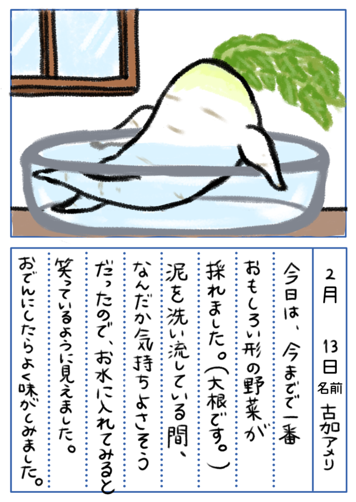 市民絵日記9 市民絵日記 2026.02.13 今日の絵日記を描いたのは、 第10話に登場したアメリさんです。 →第10話はこちらとこちら おもしろい形の野菜は販売には向かないので、 全部アメリさんが自分で食べます。