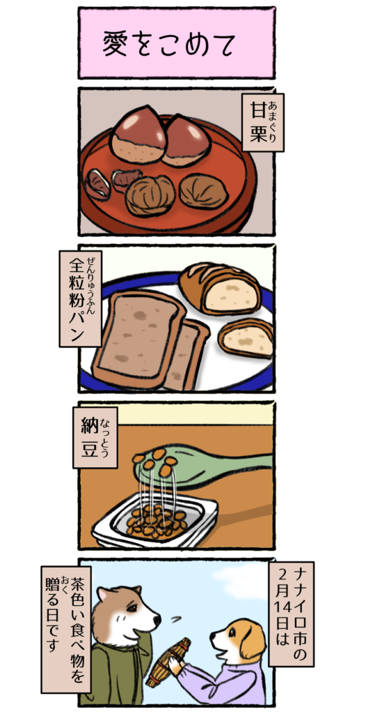 4コマ 愛をこめて 4コマまんが 2026.02.06 ですので、 『ブラウン・デー』と呼ばれています。 ちなみに、 ナナイロ市民にとってチョコレートは毒なので、 そもそもチョコ自体が存在しません。 どうぞご安心を。