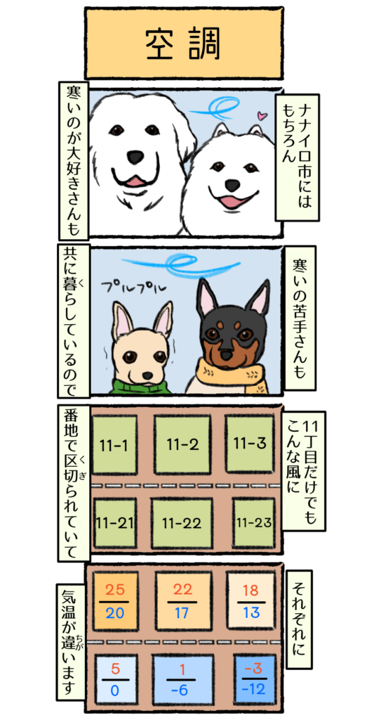 4コマ 空調 4コマまんが 2026.01.26 コマの大きさの都合で省略しましたが、 1番地~と20番地~の間には11番地~があって、 気温もその間になってます。 住民は好きな場所に住んで、 時々気分次第で自由に引っ越してます。