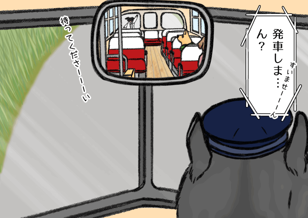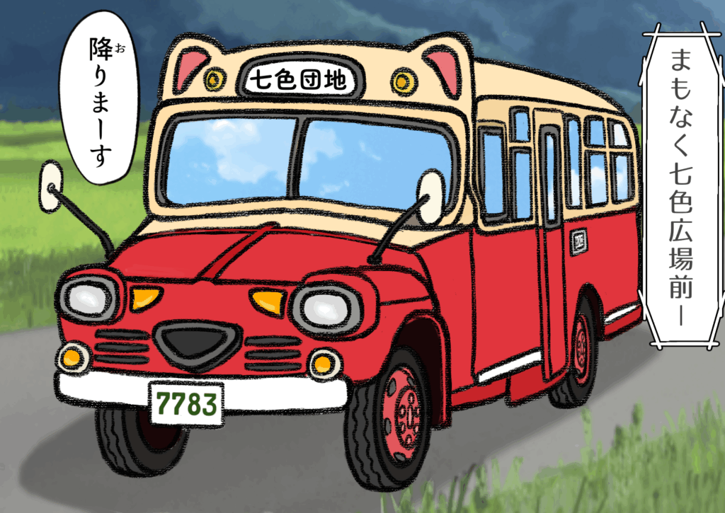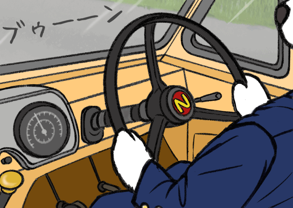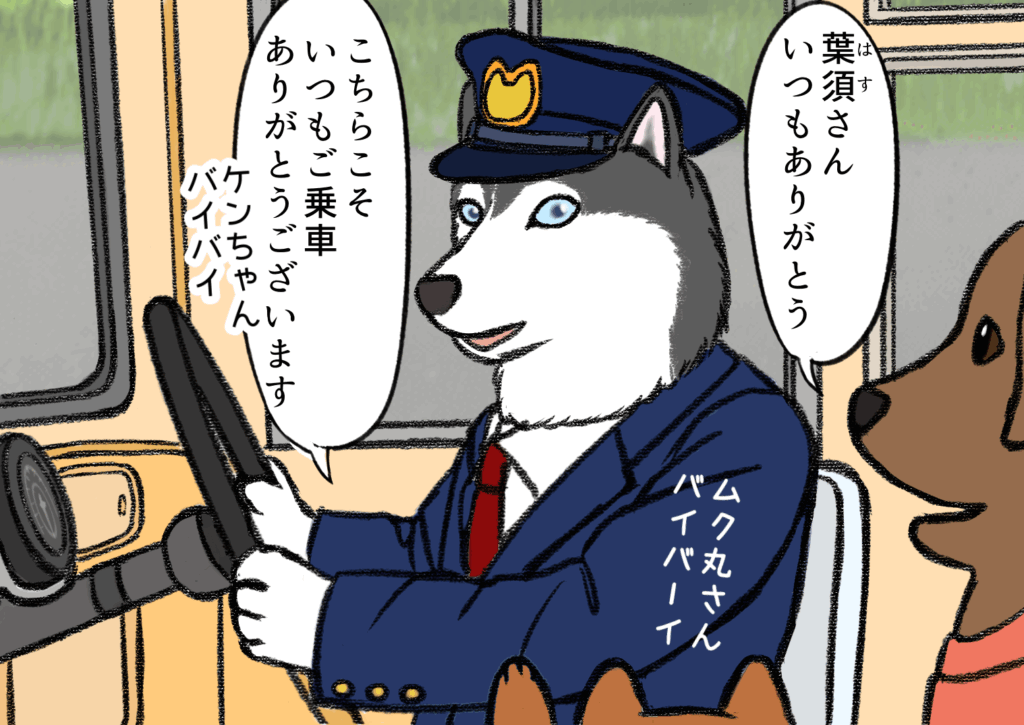 58話 おとなも乗れるよ(前編) 日常マンガ 2025.11.15 シベリアンハスキーの葉須ムク丸さん。 ナナイロ市に来る前はよくソリを引いていたので みんなを乗せて走るこの仕事が大好きです。 ちなみに見た目はレトロなボンネットバスですが、 ナナイロ市の乗り物の排気はゼロ、 とってもクリーンなのでどうぞご安心ください。 (どうやって動いてるかは皆よくわかってないです。) 後編につづく。